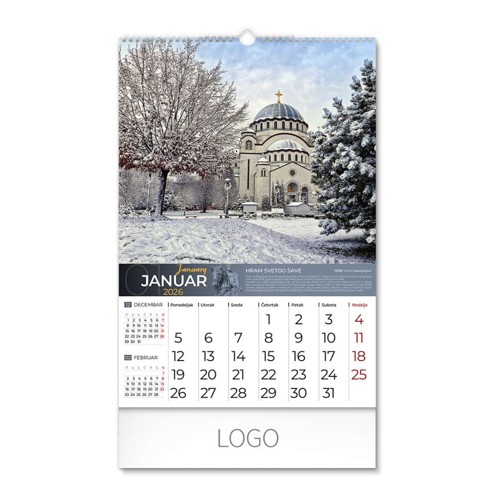 | Opis | Zidni kalendar: 13 listova, mesečni, sa LUX folijom |