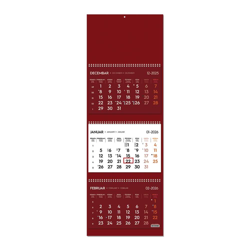 | Opis | Zidni kalendar: 3 x 12 listova, tromesečni, trodelni |