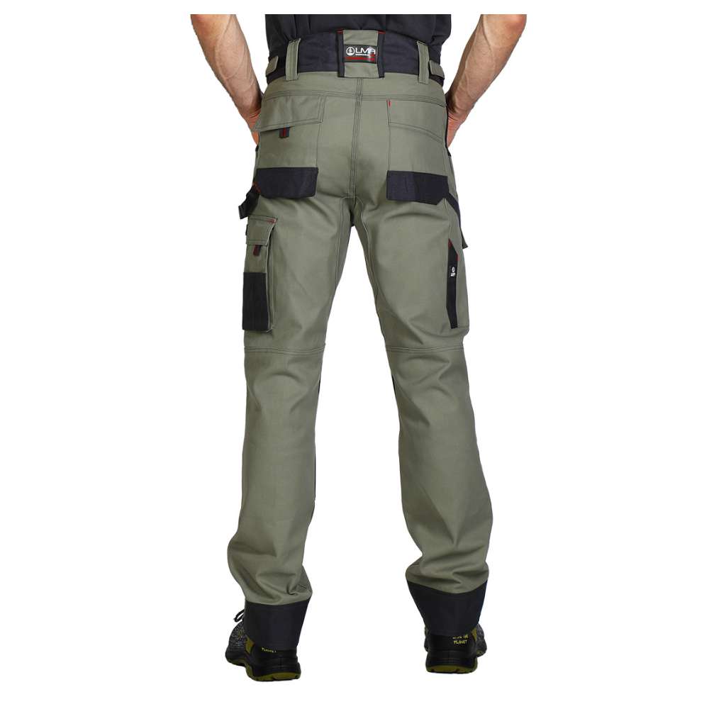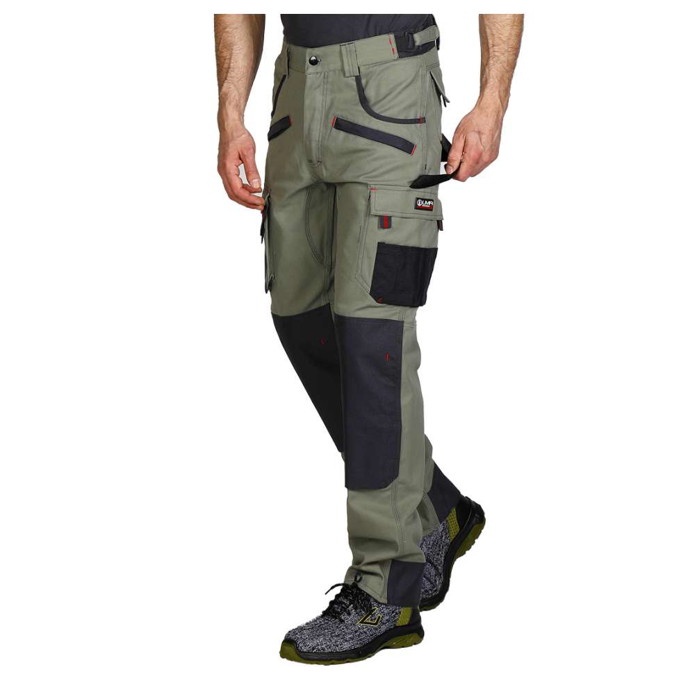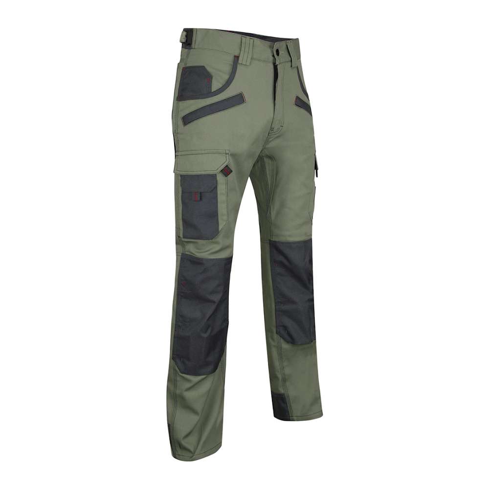 | Opis | Radne pantalone, 300g/m2 platno prepletaj, ojačanja od 900D poliestera na mestima izloženim većem habanju (džepovi, kolena), džepovi za umetanje štitnika za kolena, četiri prednja džepa (dva sa rajsferšlusom), dva džepa pozadi i dva sa strane sa praktičnim odeljcima za alat, gajka za čekić, plastične alke za ključeve, pojas sa čičak trakom za podešavanje širine u struku za dodatnu udobnost, trostruki štepovi kao ojačanje |