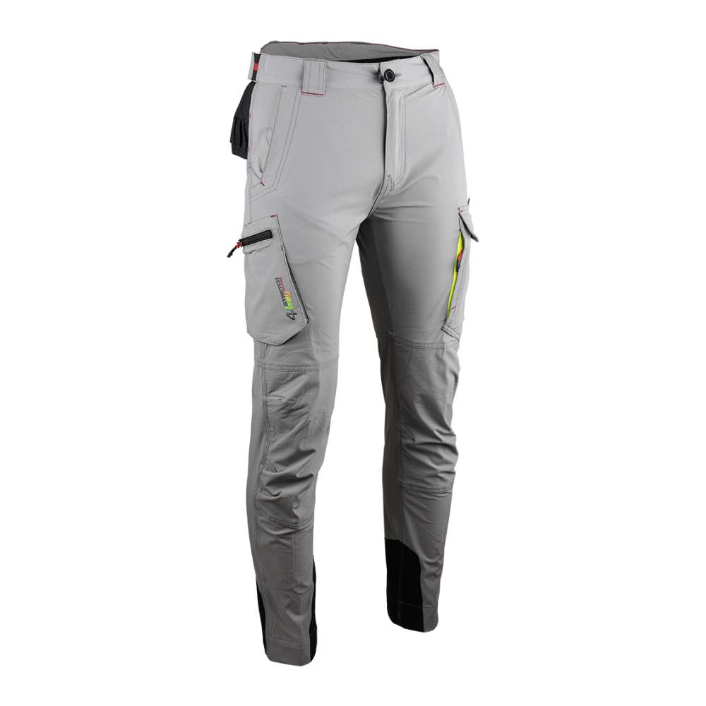 | Opis | Elastične radne pantalone od Ripstop tkanine, 155 g/m², sastava 90% poliamid, 10% elastin. Ojačanja su napravljena od vodootpornog oksforda, 175 g/m², sastava 100% poliester. Pantalone imaju fleksibilno plastično dugme (Ø 20mm), Vislon patentni šlic, produženi pojas sa zadnje strane, antiklizni struk sa elastičnom trakom pozadi, dva prednja džepa, dva džepa na butinama, zadnji džep sa preklopom, držač za alat, i ojačanje u preponama. |