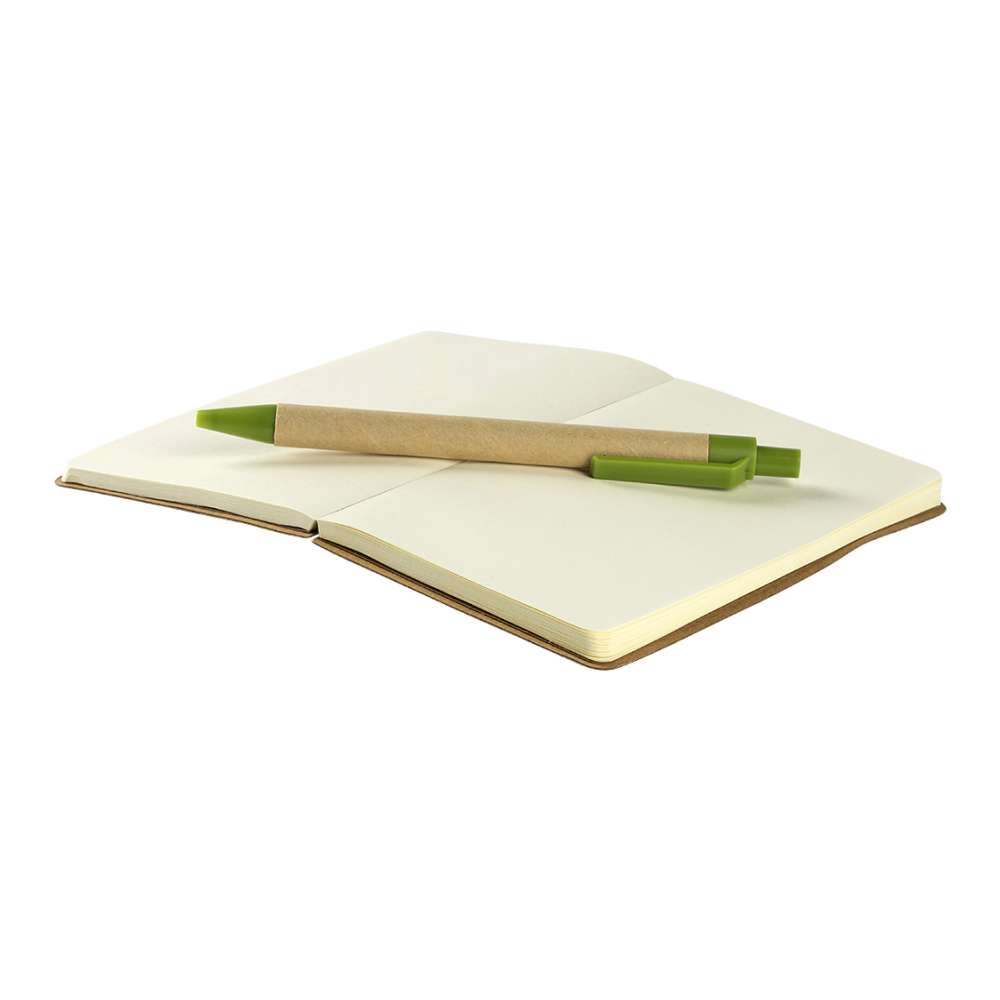 Description: This compact eco-friendly biodegradable pocket-size notebook features 70 pages of blank recycled paper. It comes with a recycled ballpoint pen that includes biodegradable plastic parts. The pen writes in blue ink.