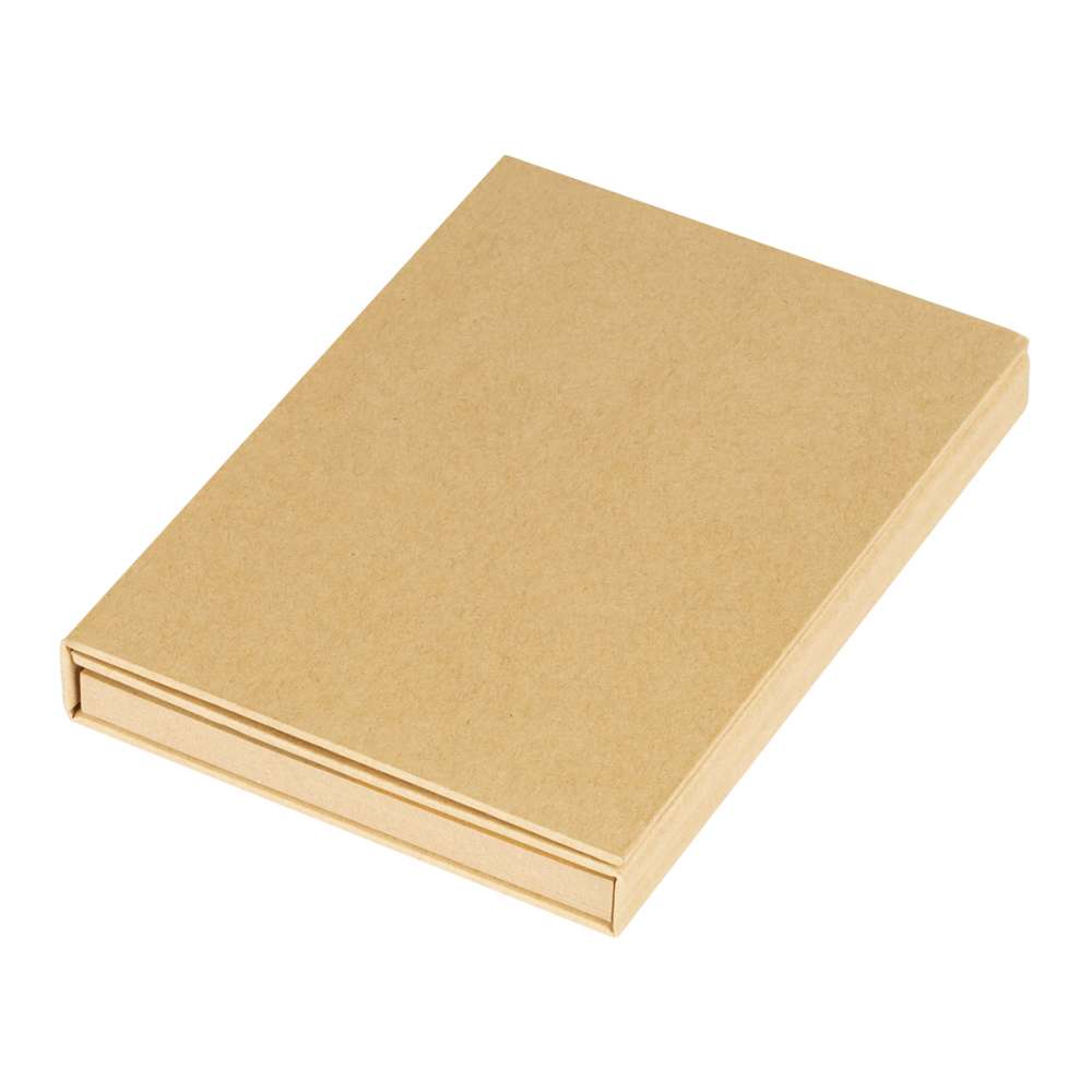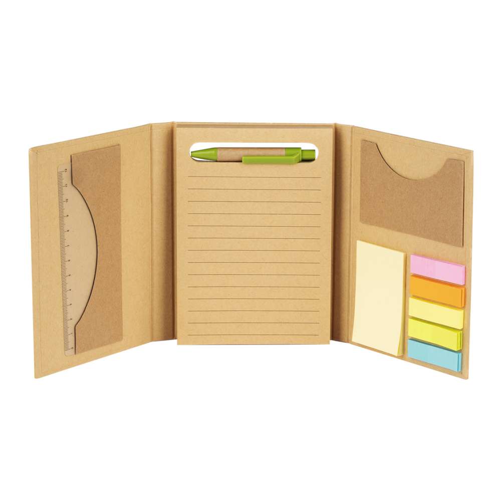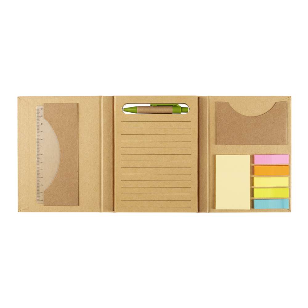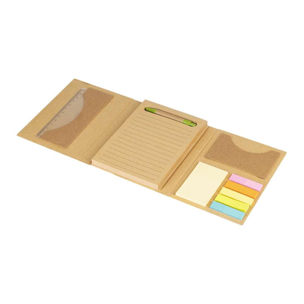 | Opis | Kancelarijski set od kartona koji sadrži blok za pisanje, samolepljive stikere, lenjir, hemijsku olovku od kraft papira i držač za vizit karte. |